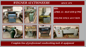 Yates 14 x 36″ variable speed, commercial grade, freestanding wood lathe, w/guard, 15 gouges, stand, 110 volt * Delta #14-650 Hollow Chisel Mortiser * Enlon Oscillating Spindle Sander * Delta Milwaukee Crescent Drill Press * Duracraft #FM-1617 Drill Press * Delta 6″ Freestanding Belt Sander * Rockwell / Delta #15-655 Drill Press * Central Pneumatic #93608 Vertical Blast Cabinet * Delta/Milwaukee Crescent 20″ Bandsaw * Sears/Craftsman 10″ Radial Arm Saw * Scrollmate #SKS-21 21″ Jigsaw * Powermatic 1 h.p. Belt Sander * Freestanding Shaper 18”x14” table * Delta 24″ Freestanding Jigsaw * Delta 1″ #31-340 Strip and Disk Sander * Delta Commercial Grade Shaper * C.R. Onsrud #2003 Inverted Router * Table MTD. Type Sander * Delta 80″ Vertical Bandsaw * Central Machinery 8″ Bench Grinder/Buffer * Craftsman Bench Grinder 1/4 hp * Central Machinery 36″ Metal Brake * Ryobi 10″ Surface Planer * P.Y.H. 1″ x 8″ Belt and Disc Sander * 3 x 5 x 2″ Maple Top Woodworking Table * Freestanding Stretcher * Freestanding Arbor Press w/ 3”x6” throat * DeWAlt 12″ Compound Miter Saw * DeWalt Model GA Radial Arm Saw * Antique 24″ Vise mounted on 5’ chassis * Powermatic Commercial Table saw * Portable Cabinet Style Dust Collector * Central Machinery Equipment Model 4C Belt Sander * Freud #FT2000E Router * Tool Shop table top Drill Press * Jet Double Drum Portable Dust Collector * Krumbach 24″ Industrial Drum Sander * Powermatic 16″ Industrial Planer * Powermatic #60 Industrial Jointer * C. H. Farmhand 60 Gallon Vertical Air Compressor * 48 x 56 x 3″ Granite Surface Place * 4 x 10 x 2.5″ Wood Roller Layout Table * 9 x 5 x 2.5″ Wooden Layout Table *QTY hand & power tools * some antiques & collectibles * wood project stock* & more.