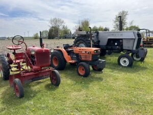 Countyline 6′ 3pt., gear driven rototiller, 5.5′ 3pt. disk, 6′ pt. finish mower, Tarter #RC104 3pt. 4′ rotary cutter, 6′ 3pt. rear blade, Kelley #55 3pt. backhoe, 25′ hyd. bucket mounted on running gear * Custom 4’ leveling blade * 9’ field cultivator * Oliver 2 bottom plow * 6’ 3pt. Field cultivator * MM #6 walk behind plow * 5.5’ 3pt. Rear bucket * Ford #706 dirt scoop * Fimco 25 gal. 12v trailer sprayer w/booms * Ford 3pt. Buzz saw * Ford wagon running gear w/gravity box