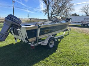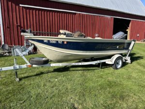 Sylvan 1600 Explorer 16’ Alum. Gull Wing design Fishing Boat – w/Johnson 50 h.p. outboard, EZ loader bunk trailer, console control, fishing gear & cover (nice unit with lots of storage)