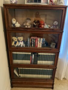 Oak 4-section Barrister style stacking bookcase * La-Z-Boy floral pattern sofa * Blue stripped rocker/recliner * Oak 3-piece bedroom set *  Sm. Bookcases * Sentry ValueGuard 1250 16×18” fireproof safe * Martha Washington style sewing cabinet * 76” Slim line curio cabinet * Nice oak armoir * Oak serpentine front dresser * Cast iron/wooden park bench * Sm. Oak dinette set * Pair arts & crafts style oak drawered end tables * Sm. Oak parlor table * Slimline jewelry cabinet * Howard Miller Career award clock * Maytag wringer washer * Pots, pans & general household merchandise