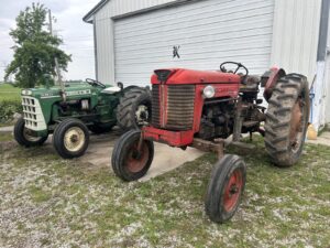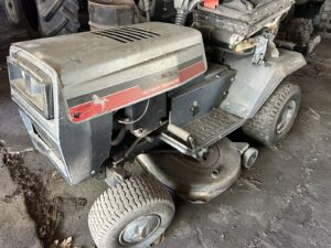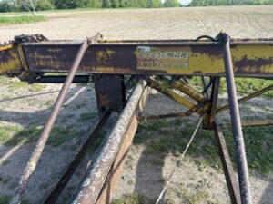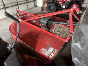 Eversman 3212 Land Leveler, front gauge wheels * Brillion 6 row cultivator * 3pt. V ditcher * 7′ HD 3pt back blade * IH HD loader forks * Oliver running gear * Upright 300 gallon fuel tanks * Honda 700 rear tine tiller * Farmhand 3 row beer topper * Air-o-vac grain aerator * Killbros no.300 gravity box w/fertilizer auger, poor condition, on nice John Deere running gear * Fanning mill w/auger * AT Ferrell bean separator * Delhi 7′ 3pt snowblower * 3pt. Buzz saw unit, pto driven * SpeeCo Late model 3pt. Log splitter * Brush hog BH116 6′ 3pt brush cutter * (2) Simplicity riding mowers * White LT-120 lawn tractor * 14’ round 5-ring grain bin w/metal top *