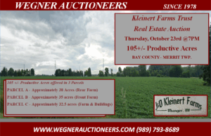 * A $10,000 Earnest money deposit in the form of cash or cashier check to: Wegner Auctioneers is required from successful bidder per parcel purchased, upon purchase agreement signing October 24th to take place @1089 S. Knight Rd. Munger, MI w/ appointment with a auctioneer.